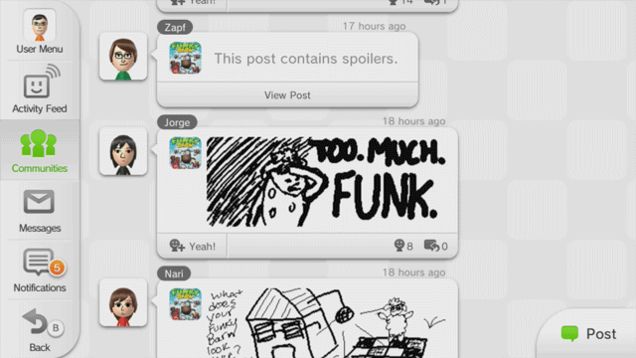 Sometimes I’ll boot up the Wii U or 3DS just to check Miiverse, with no intention of playing a game. It’s a lovely wee world where almost everyone is nice to each other, anything questionable is quickly moderated and it just puts a big smile on your face.