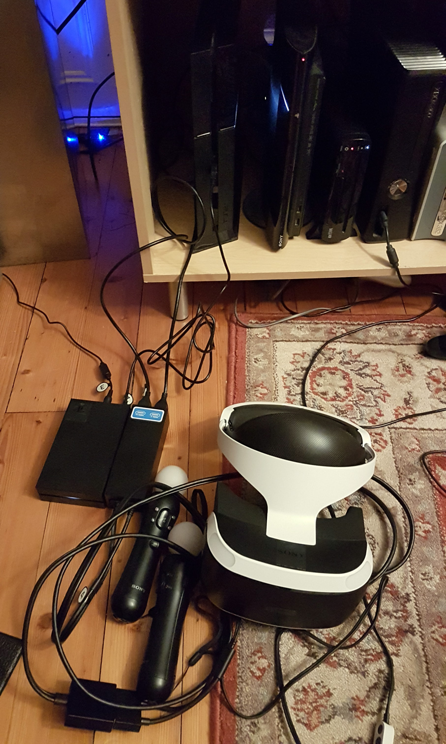 Then you need to have a power cable running to the processing unit, another USB cable plugging into the front of the PS4 so it can communicate with it, and then the headset itself which attaches two more lengthy cables to it.