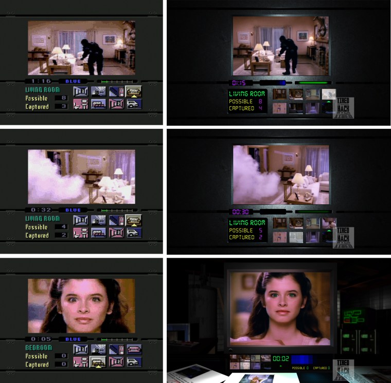 On the right are the exact same moments in Night Trap: 25th Anniversary Edition. The game comes with a number of different UI ‘themes’ based on the Mega CD, 3DO and PC layouts: the first two examples here are using the Mega CD layout, the bottom one is the new one exclusive to this remaster, which gives you a bigger picture.