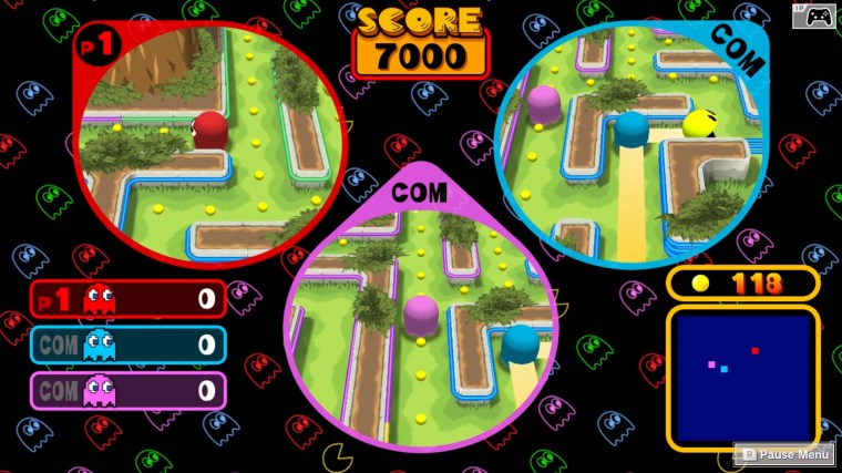 If you only have one Switch, there’s an alternative mode in which Pac-Man is AI-controlled and 1-3 players control ghosts trying to catch him. This mode is nowhere near as entertaining.