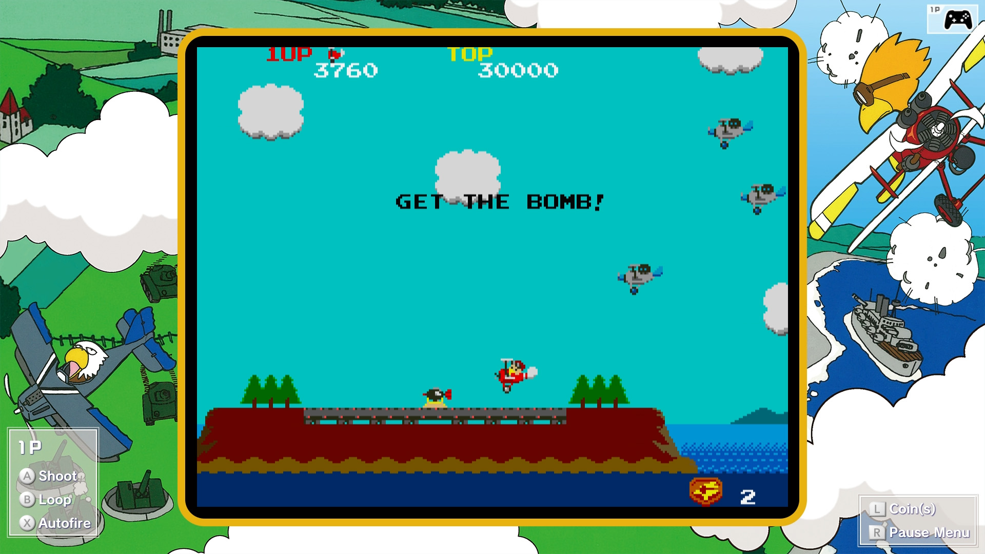 It’s a side-scrolling shooter in which you play as either Red Baron or Blue Max, with the aim being to collect a bomb partway through each level and drop it on a target near the end of the stage, before landing safely.