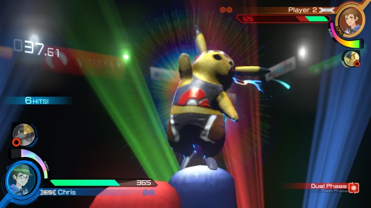 In the field phase your Pokemon can roam around the arena, firing projectiles and trying to avoid the other player’s until you’re able to close in for a physical attack.