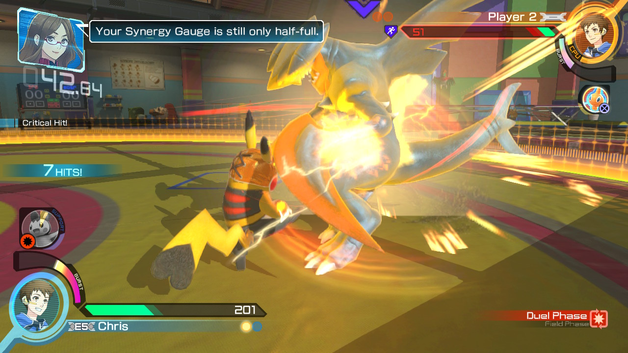 In the field phase your Pokemon can roam around the arena, firing projectiles and trying to avoid the other player’s until you’re able to close in for a physical attack.