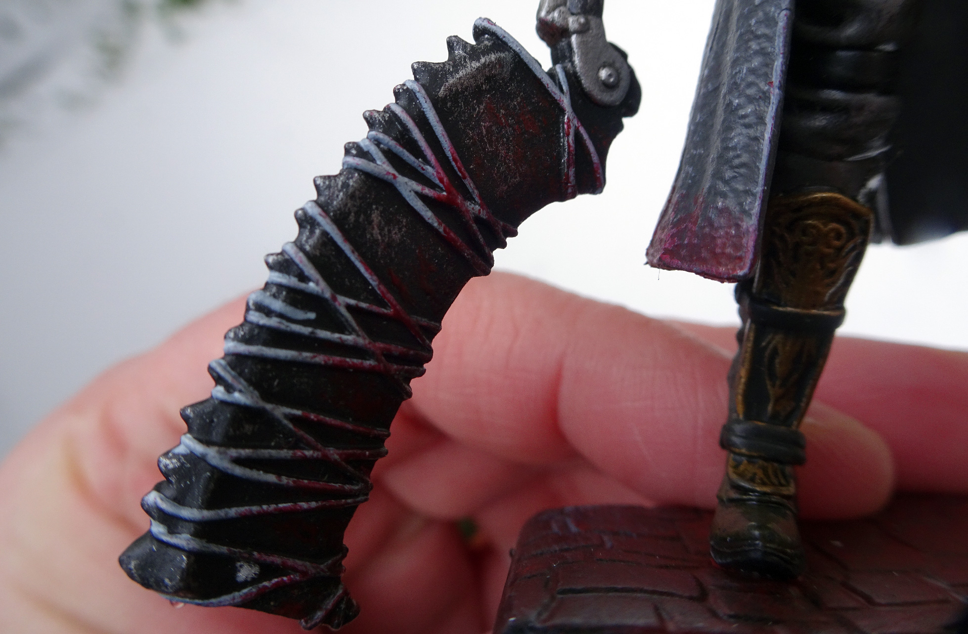He’s also armed with two weapons: his trusty saw cleaver, and his gun. Both are intricately detailed for their size.