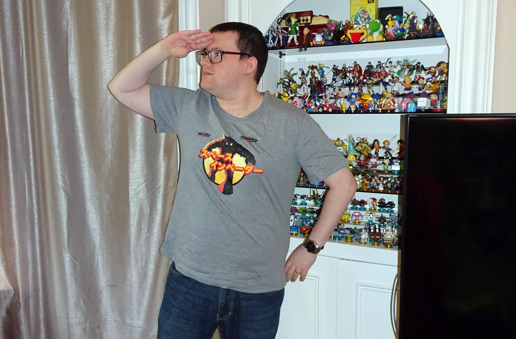 I am reliably informed by Google Translate, however, that the katakana text inscribed on the front of this shirt says “Space Invaders”.