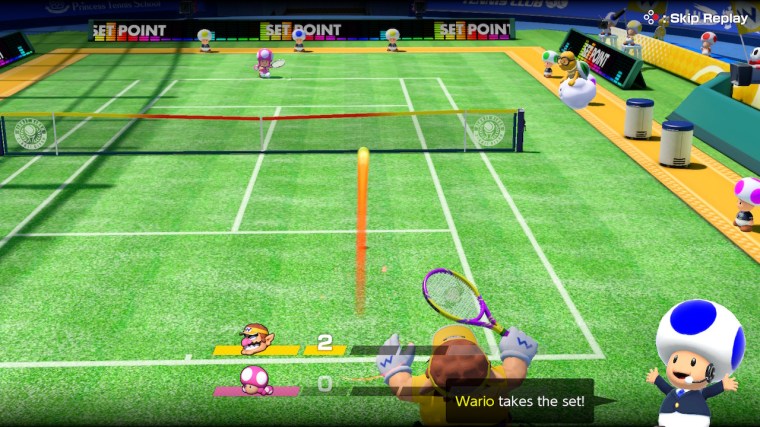 You level up Mario’s stats after each event, and as you progress you gain a bunch of extra rackets to add to your repertoire, each with different effects: one has flames around it, one is made of mirrored glass, and the like.