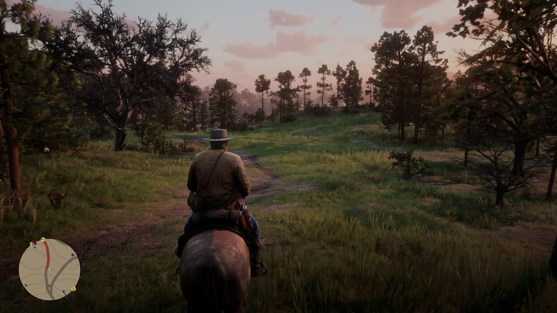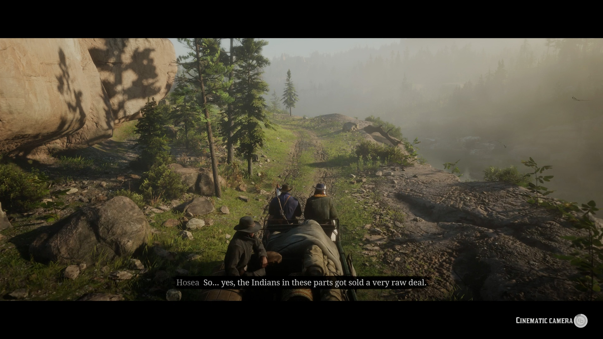 Sitting back is something you can do now, incidentally. During these scenes (or any other time in the game when you’ve set a waypoint) you can hold down a button to fix your horse’s speed, then hold down another to toggle a cinematic camera.