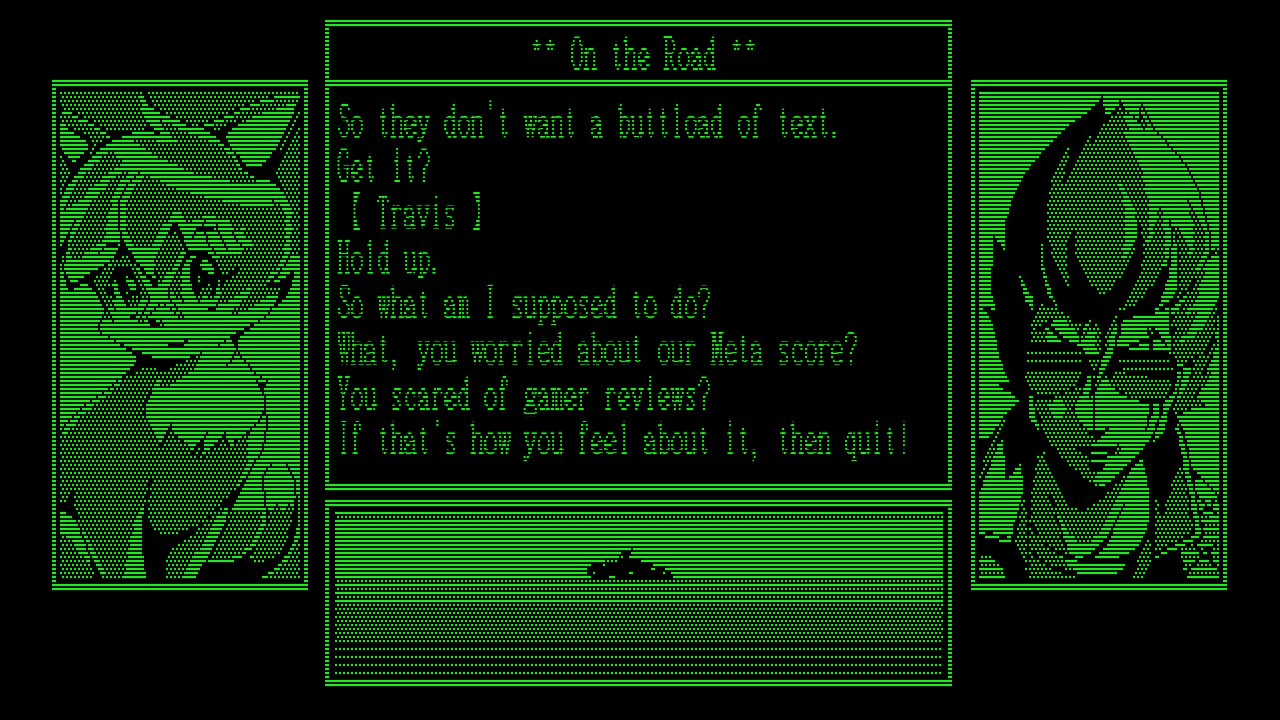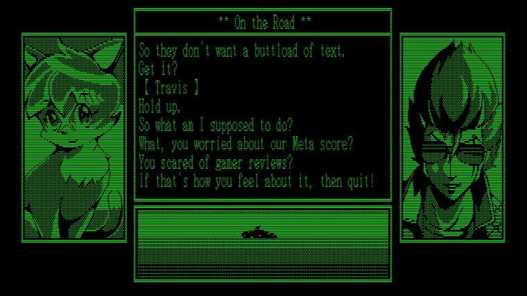 Meanwhile, the aforementioned claims that nobody bought the game to read are soundly ignored with the presence of Travis Strikes Back, a visual novel presented as an Apple II / TRS-80 style adventure with green pixelated graphics and chiptune music.