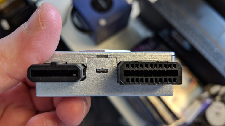 This little rectangular wedge has two prongs on the back and plugs into both the digital and analogue ports on the back of your GameCube (note: Nintendo ditched the digital port near the end of the GameCube’s life, so the GCHD won’t work on some of the later models).