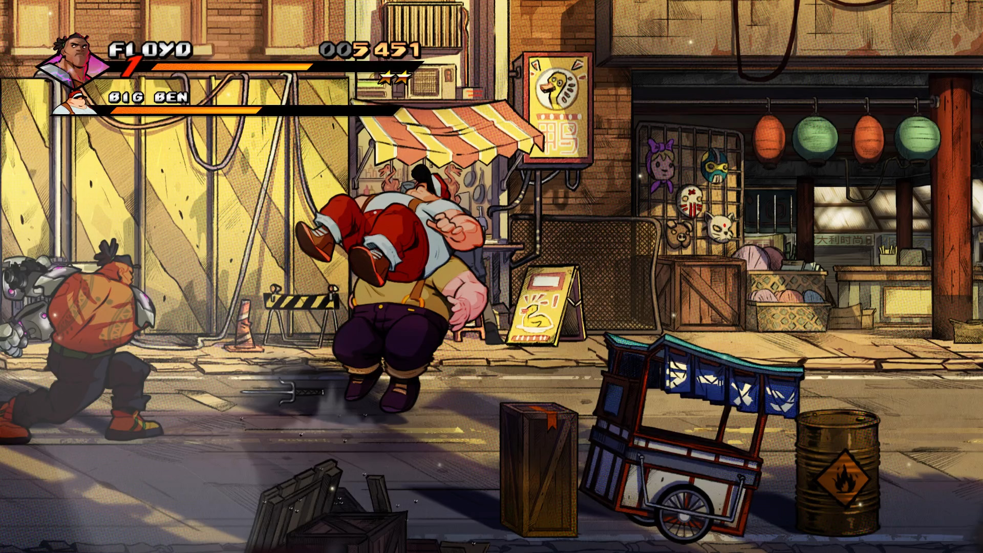 This means if you’re quick enough you can actually grab two opponents and bash their heads together. I’m not sure if it’ll ever get old, but it definitely hasn’t yet. Alternatively, if you just decide to stick with one enemy, Floyd’s throw is easily the best in the game, flinging folk right across the screen. Line up a throw against a group of baddies and they’ll turn into human skittles. As in the ten-pin kind, not the sweets.